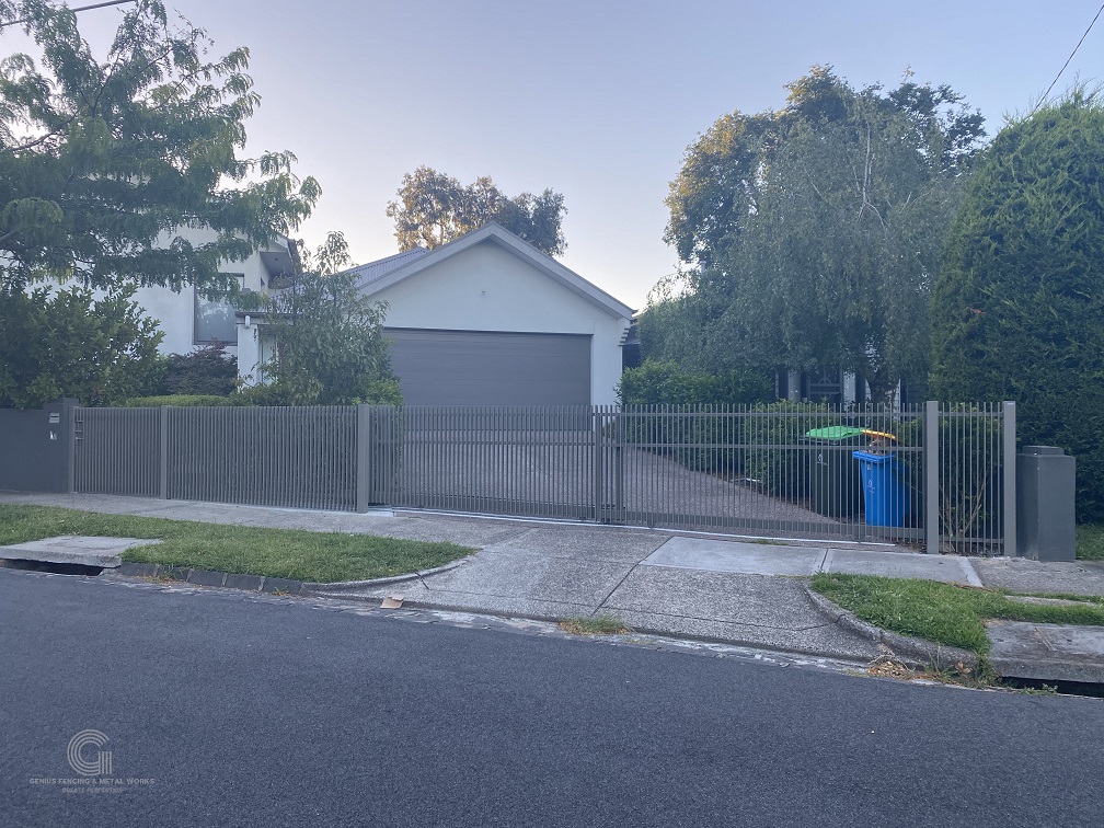 Vertical Blade Telescopic Sliding gate with fence and pedestrian gate level out at same high.