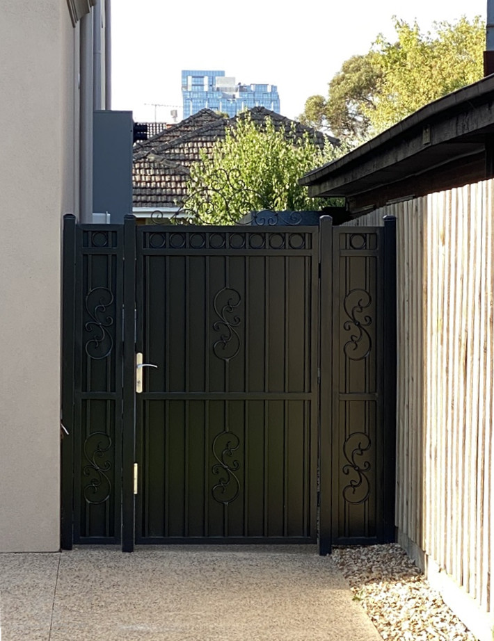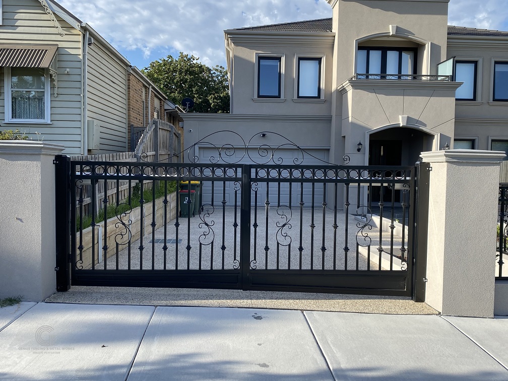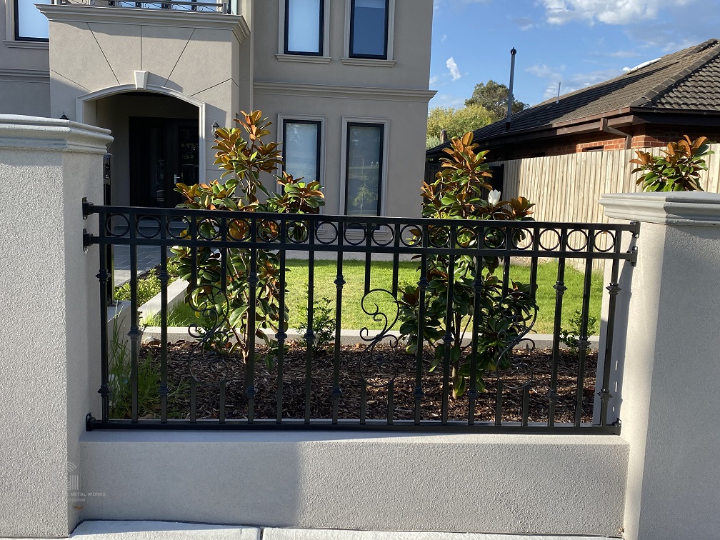 Classic tubular steel fence and gate with bushes and scroll decoration