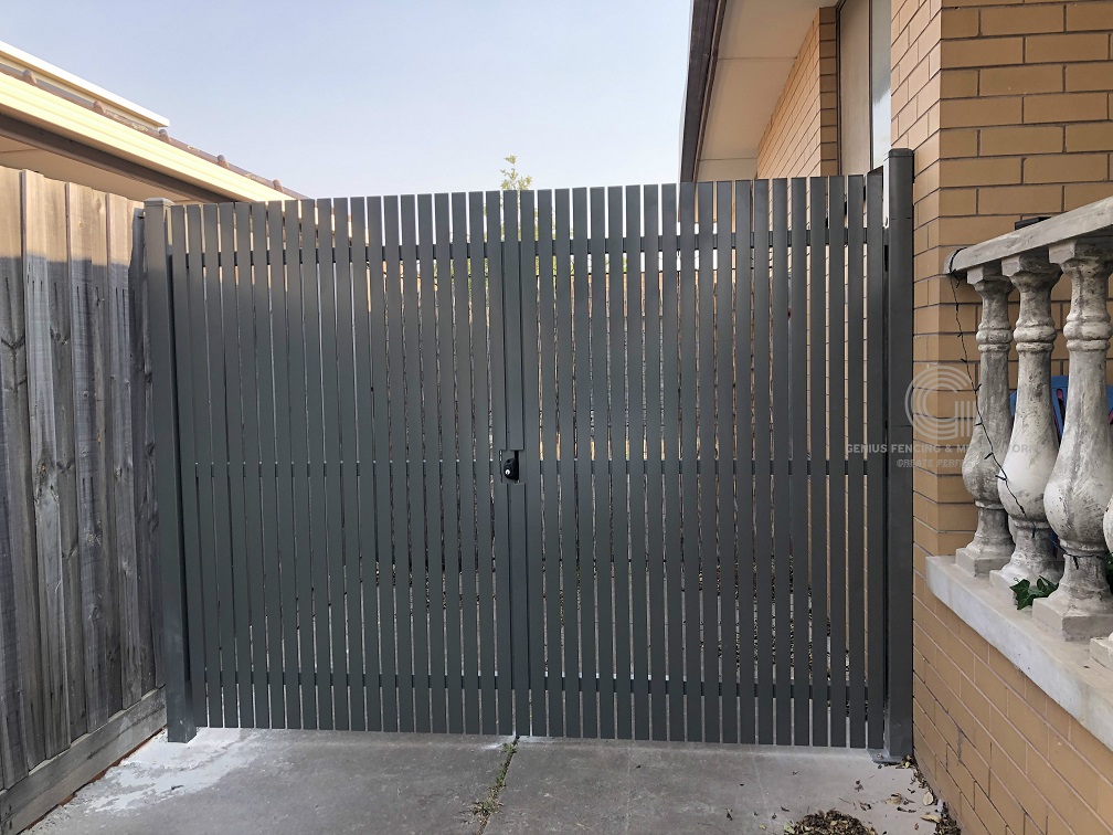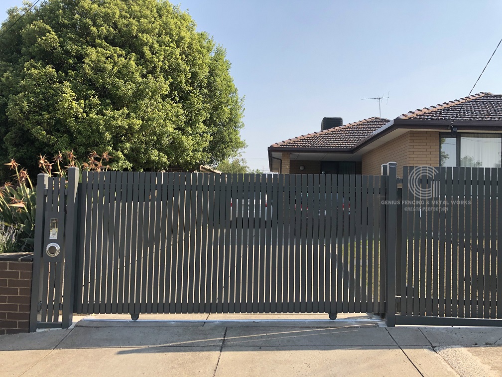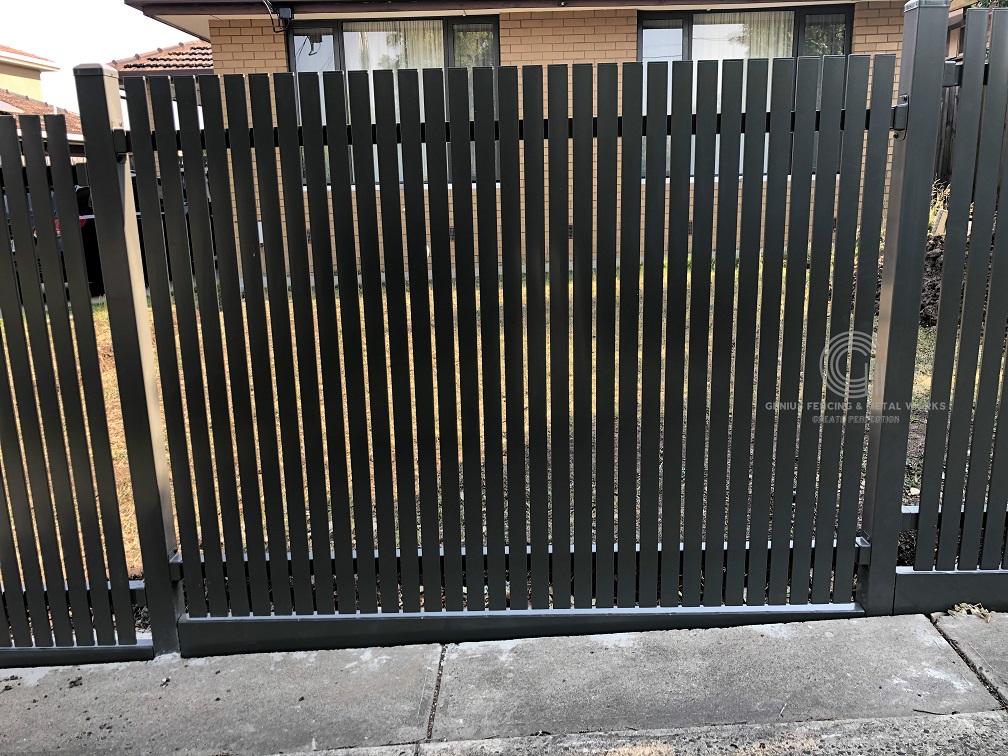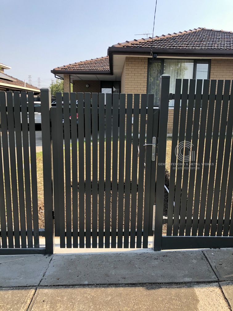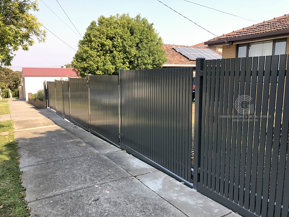 Vertical Slat - Steel Picket Fence in Woodland Grey with Customised Bottom Plinth